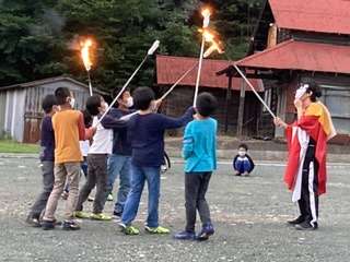 19時からキャンプファイヤーが始まりました。子どもたちが選曲した歌を歌ったあと、キャンプファイヤー係の先導に火の神様をみんなで呼びました。呼び方がとてもおもしろいです。子どもたちが帰ったら再現してもらってくださいね。みんな楽しくゲームをしました。