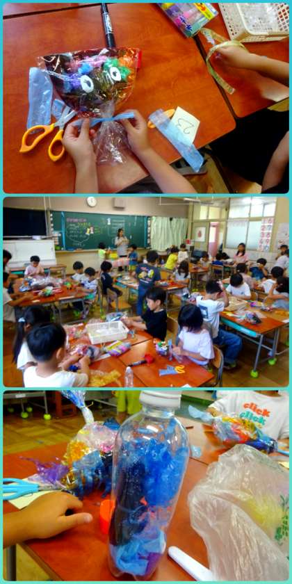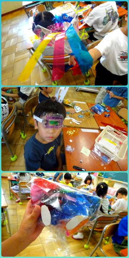 図工「ひかりのくにのなかまたち」です。袋にセロハンを入れて、楽しいなかまを作ります。