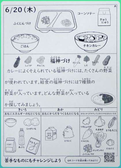 今日の給食は、チキンカレー、コーンソテー、福神漬です。