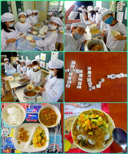 今日の給食は、チキンカレー、コーンソテー、福神漬です。