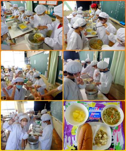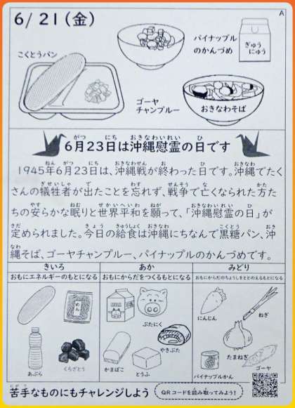 今日の給食は、黒糖パン、沖縄そば、ゴーヤチャンプルー、パイナップルの缶詰です。