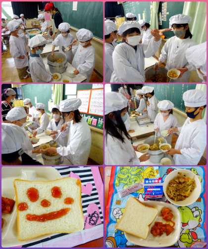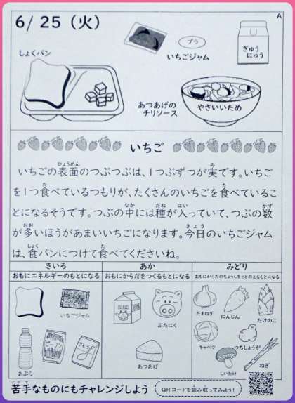 今日の給食は、食パン、野菜炒め、厚揚げのチリソース、いちごジャムです。
