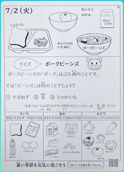 今日の給食は、ポークビーンズ、キャベツの炒め煮、冷凍みかんです。