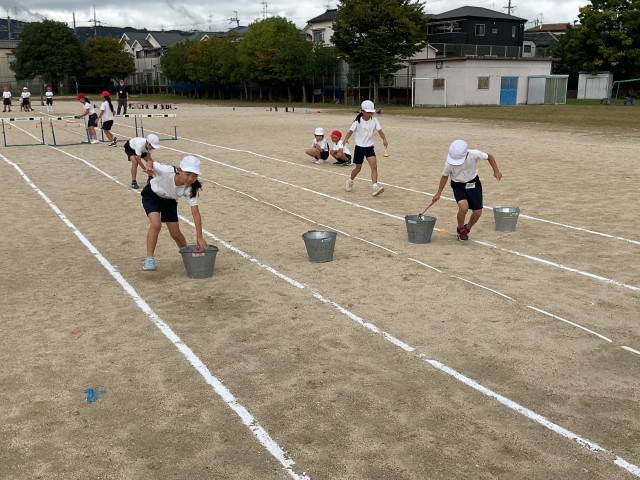 本校の団体競技は、1年生〜6年生までのたてわりで「玉入れ」「リレー」「つな引き」の選択種目になっています。どの競技も高学年の児童が下の学年の児童を補い助けあいコツを教え合うなど交流しながら練習をしていました。