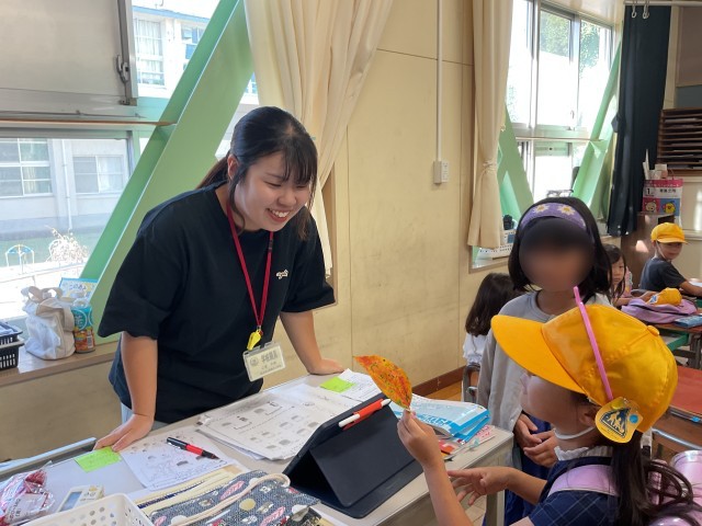 最近はWBGT熱中症指数が31を超え、外遊びができない日も多いのですが、今日の4時間目は外に出て秋の虫取りと観察をすることができました。トンボがたくさん飛んでいて、「なかなか捕まえられないよ!」と言いながら虫網を持って追いかけていました。他にもコオロギやバッタを虫がごいっぱいに捕まえて観察していました。