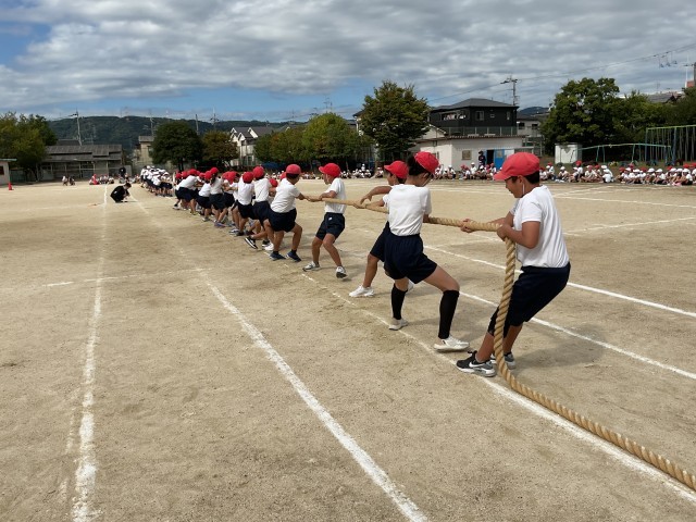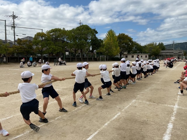 本校の団体競技は、1年生〜6年生までのたてわりで「玉入れ」「リレー」「つな引き」の選択種目になっています。どの競技も高学年の児童が下の学年の児童を補い助けあいコツを教え合うなど交流しながら練習をしていました。