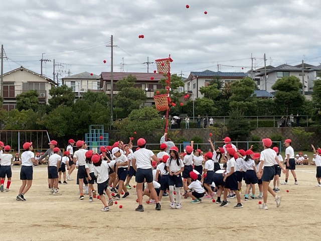 高学年の児童と低学年の児童が手を繋いで入場しました。ジャンボリーミッキーと唱の曲に合わせてダンスをして、曲が止まったら一斉に球をつかんで籠をめがけて投げます。夢中で投げてどんどん入っていきました。