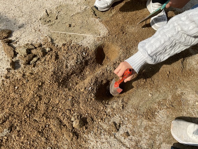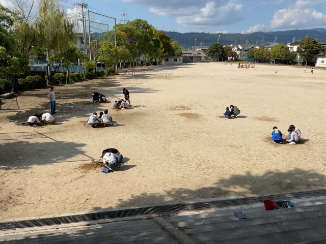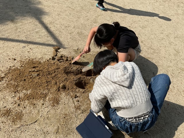 何やらスコップで運動場を掘り返しています。地層とまでは言えないものの、地面を掘ってみると表面の砂は白っぽいですが、掘っていくと赤っぽい土や黒っぽい土の層は見てとれます。地球上には様々な地層が存在します。興味関心を持って、これからの学習に向かうことでしょう。