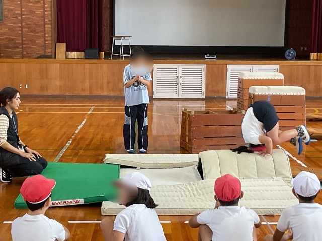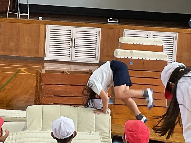 体育館では、3年生が台上前転の練習をしていました。はじめは恐々だった児童も先生に補助されながら慣れてきて、挑戦していました。「がんばれ」「大丈夫!」「怖くないよ」「上手!」みんなの励ましも後押ししてくれています。