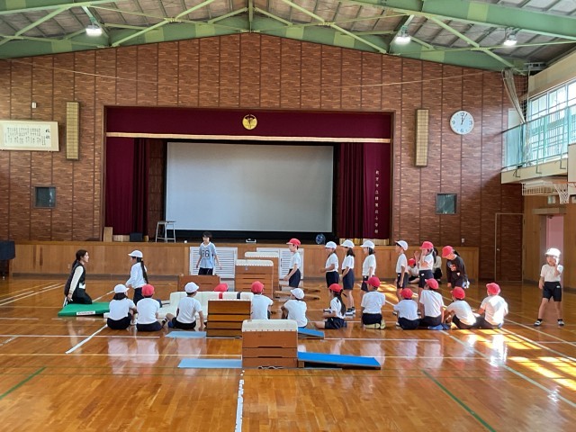2年生の体育科では、身体作り運動を行なっています。日常ではなかなか使わない身体の部位を意識しながら行なっていました。自分の腕で体重を支える動作や手のひらと肩を意識して重心移動の動作、また、高さを変えたゴムを飛び越える際に片足づつ跳んだり、両脚で跳んだりする動作など、自分の身体をうまく使うことで怪我の防止や身体能力の向上を目指します。