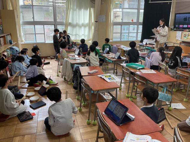 2年生は音楽です。自分たちでリズムを考え発表しあっていました。
