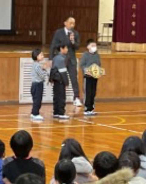 24日の2学期の終業式に引き続き、児童会の児童が劇を交えて「冬休みの生活」夜更かしや生活リズムについてと不審者対応について気をつけることをわかりやすく注意喚起してくれました。また、2学期中コンクールや大会などで表彰された児童をみんなの前で紹介しました。
