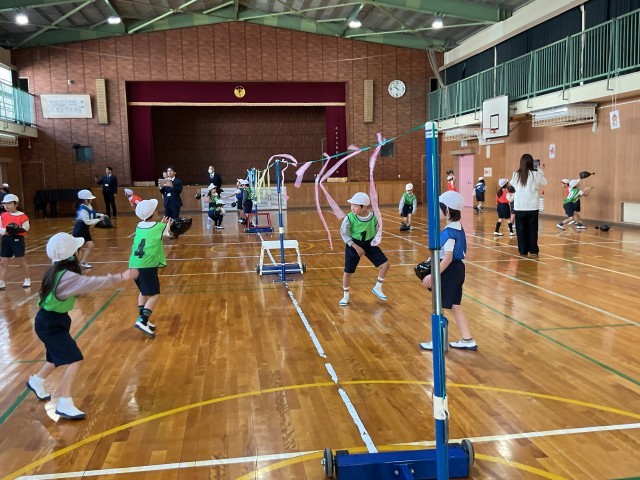1年生では、ボールゲームにつながる易しいゲームとして「ボンバーゲーム」に取り組んでいます。1年生のアンケートによると、ボールを受けたり獲ったりすることが怖いと感じていたり、ボールを投げ入れたりすることが苦手と感じている児童もいました。そこで、苦手感を取り払うためにボールに見立てた手作りのボールがわりのボンバーを使ってネット型のゲームをしています。この日は、その様子を教育委員会の指導主事が授業を見にきていました。