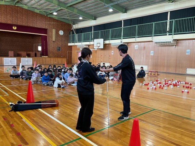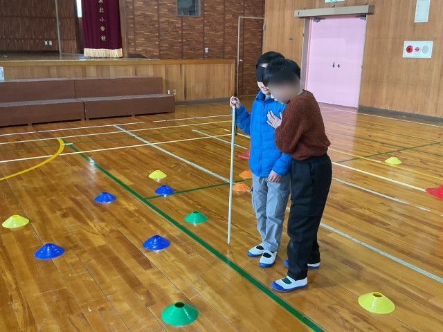 4年生は総合的な学習の時間では、福祉の学習をしています。この日はアイマスクと白杖を使った歩行体験を行いました。知っている場所の体育館や体育館周りでも見えないことで感じたことや体験して初めてわかる気づきから、福祉についてさらに学びを深めていきます。