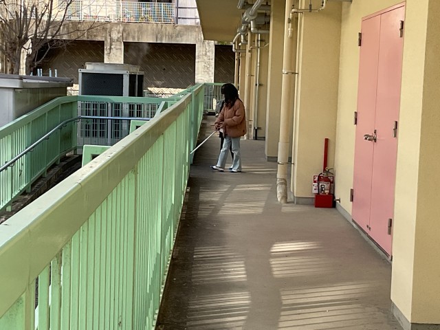 バスに乗るまでの短い距離でも、自転車や車、歩行者など周りを見ながら歩きます。