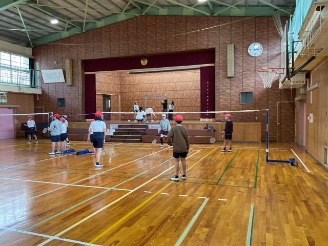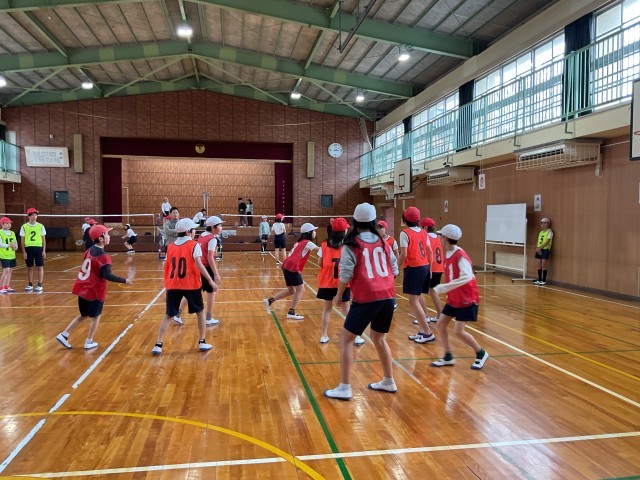 4年生の体育館での体育では、キャッチバレーボールを行なっていました。小学校の体育のボールゲームは主に、「ゴール型(サッカーー・バスケットボール・ハンドボール・ポートボール等)」「ネット型(ソフトバレーボール・プレルボール等)」「ベースボール型(ティーボール・キックベースボール・三角ベースボール等)」様々なゲーム型の運動を行います。今日は、ネット型のキャッチバレーボールを行なっていました。