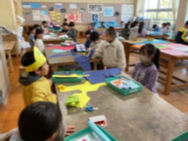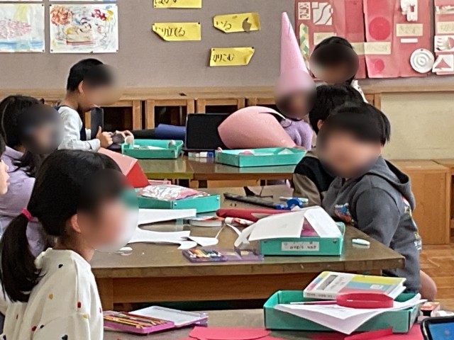 1年生の図画工作科では、「つくって へんしん」の学習が始まりました。子どもの発想で変身する目的を持って材料に向かい、今まで培ってきた紙や材料への知識や経験を駆使し、どうやったら変身できるかを思考し、材料や作り方を選んだり相応しいか判断し、想像したことを工作で表現する単元です。どんな返信があるか楽しみです。