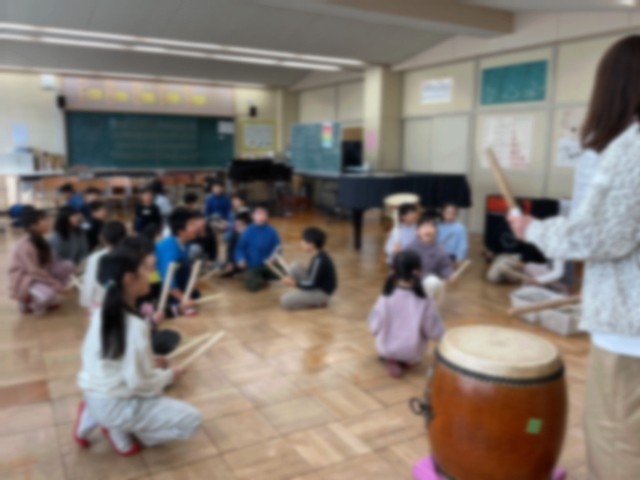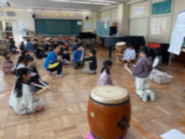 2年生も1年間の成長と学びの成果を今度の授業参観で見ていただこうと、一生懸命練習しています。今日は和太鼓の練習です。「ドドンコドン!」と口唱歌を元気よく唱えながら、和太鼓のリズムを練習していました。
