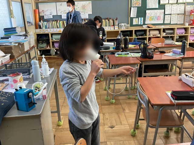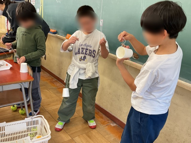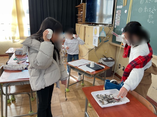 3年生の理科では、「音の性質」について、音が伝わる時に振動が「空気」や「糸」や「物」を伝っていくものであるということを、実験を通して体験していました。
