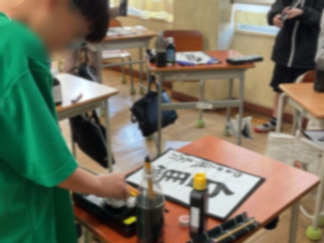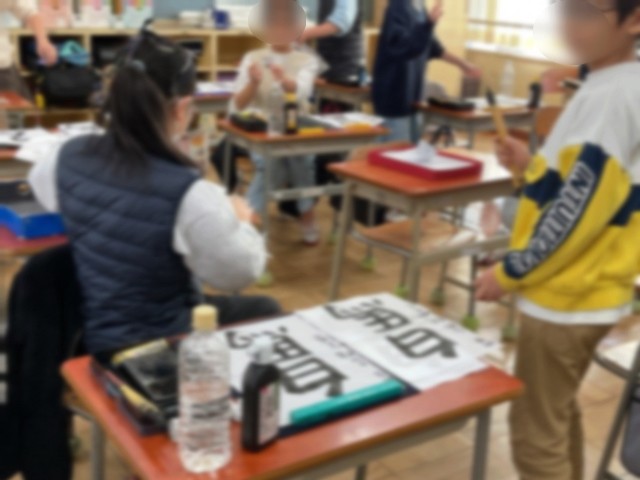4年生の書写の様子です。この日の書写は「白馬」を毛筆で書いていました。1年間でずいぶん上手になりました。何枚か清書してどれが一番いいか友達と見せ合って選んでいました。