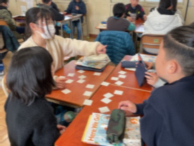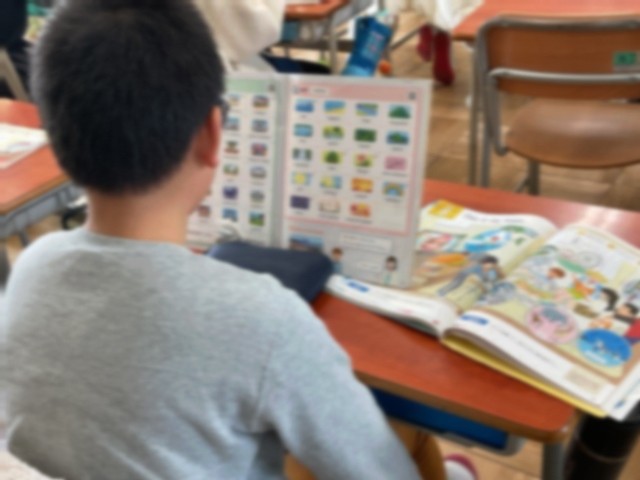 5年生の英語学習では、「This is my town」の単元では、身近な町の施設(公園・図書館・郵便局など)の英語での単語を知り、自分たちの町には〜がありますなどを伝え合う学習をしていました。