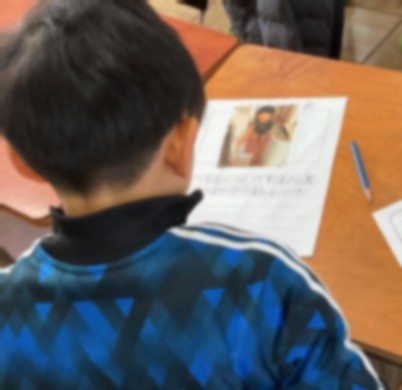 4年生は版画に挑戦します。初めての彫刻刀にドキドキ緊張感が伝わってきました。指や手を怪我しないように、ての置き場所や力の加減など気をつけるように話を聞き、緊張しながら慎重に彫刻刀で掘っていました。