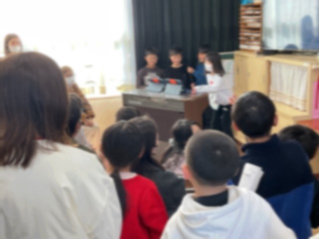 委員会の活動で図書委員会の児童が「本の福袋」を作成しまし、今日の全校集会でイベントの告知をしました。福袋にはそれぞれの子どもがおすすめの本を入れ、表紙には子どもたちがおすすめの理由を書いてくれています。自分では選ばないジャンルの本でも、福袋だと思わず手に取りたくなりますね。たくさんの本に親しんでください。