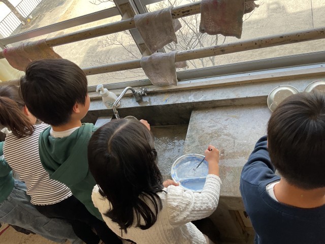 図画工作科では「できたらいいな こんなこと」ととして、自分の楽しかった経験に、ありえない夢を足し算して、絵に表してみようという単元です。想像力を膨らませ、楽しんでのびのびと描いていました。終わった後の図工室の片付けも、みんなで協力して絵の具がついていないか点検して隅々まで拭きあげていました。さすがもうすぐ2年生です。