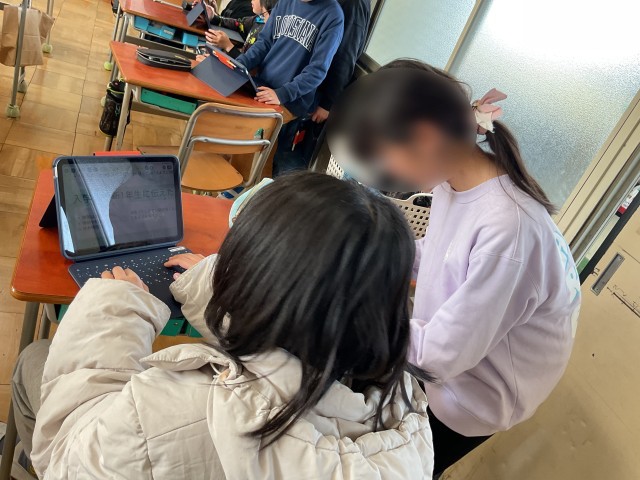 1年生は「6年生を送る会」に向けて、歌や呼びかけの言葉の練習に向けて、6年生にお世話になったことを思い出してみようの取り組みをしていました。1年生で配布されたタブレットを上手に操作して、6年生との思い出やその時感じた気持ちなどを思い出して入力していました。