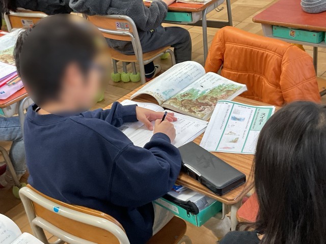 5年生の英語学習では、「This is my town」の単元では、身近な町の施設(公園・図書館・郵便局など)の英語での単語を知り、自分たちの町には〜がありますなどを伝え合う学習をしていました。