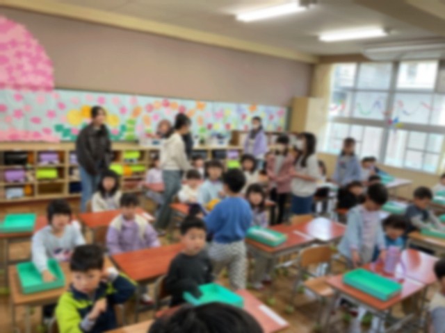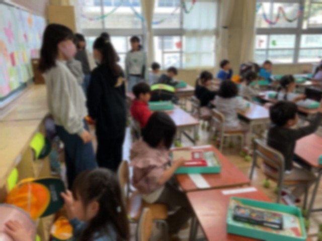 朝の登校後の教室の様子です。新1年生の教室では、スーパー6年生がランドセルの片付け方や水筒の置き場所など教えてくれていました。小さくてかわいい1年生を前に、6年生のお兄さんおねんさんも中腰になって優しく話しかけていました。