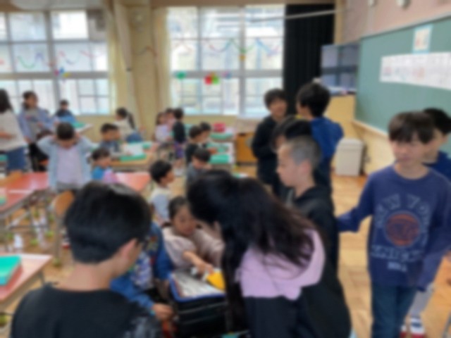 1年生と6年生のきょうだい学級では、6年生がいろいろ考えたコーナーに、きょうだい学級の1年生を招いて「くず北バザール」を行っていました。