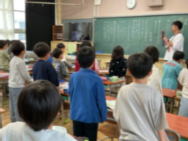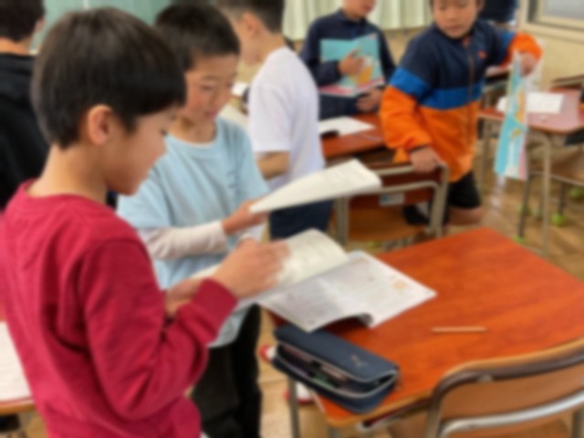 教科書の内扉の詩「春の子ども」を音読していました。何度も声を出して音読するうちに覚えています。先生が黒板の詩を少しずつ消していっても、スラスラと自信を持って音読していました。