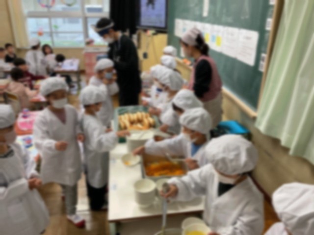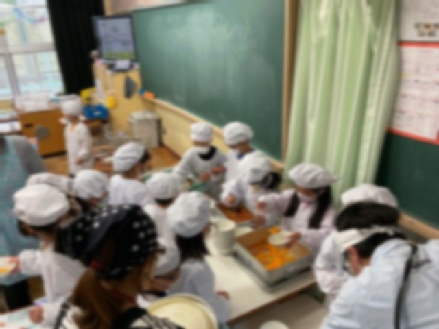 配膳では、「同じ量になるようにしよう」と、「少ないかな、多いかな」と声をかけ合いながら丁寧に準備をする姿が見られました。