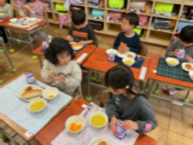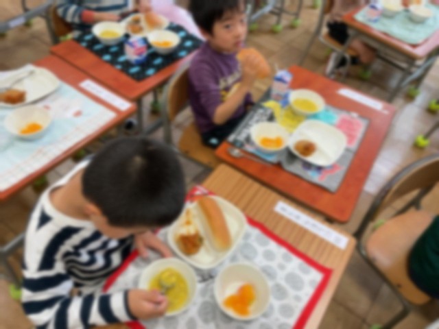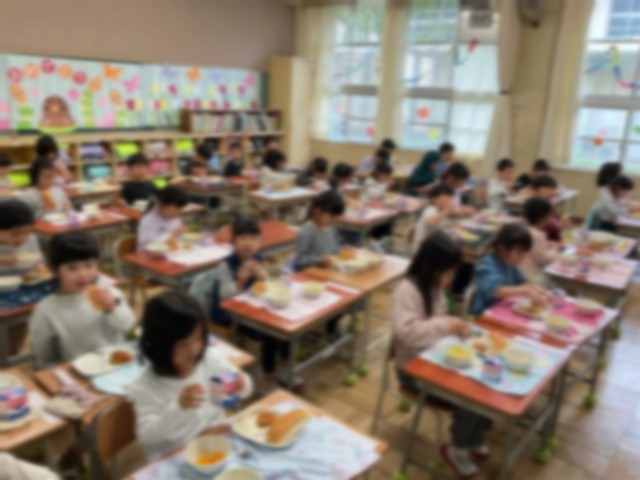 楽しみにしていた給食時間に、「おいしい」「パンがふわふわ」とうれしそうな声が広がりました。