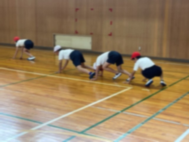 手を床につけながら進んだり、仰向けの姿勢で進んだり、つま先立ちでバランスをとりながら歩いたりと、普段とは違う動きに挑戦しています。また、いろいろな走り方にも取り組み、グループごとに工夫しながら活動しています。友だちと声をかけ合いながら、楽しんで体を動かす姿が見られました。