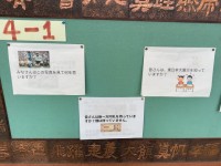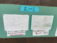 渡り廊下のくず北ホームワークを貼るコーナーに立ち止まって、紙をめくる児童の姿が見...