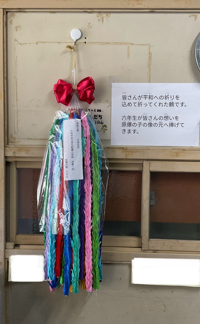 職員室前には、全校児童が協力した折り鶴が飾られています。6年生が修学旅行で広島に持参し、セレモニーで原爆の子の像の前に奉納します。