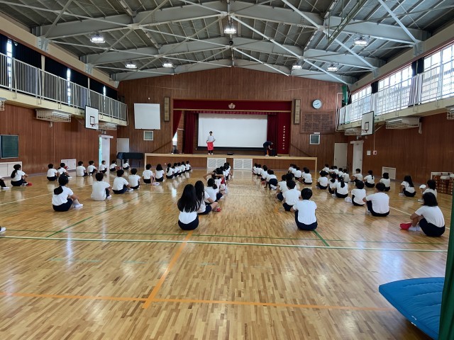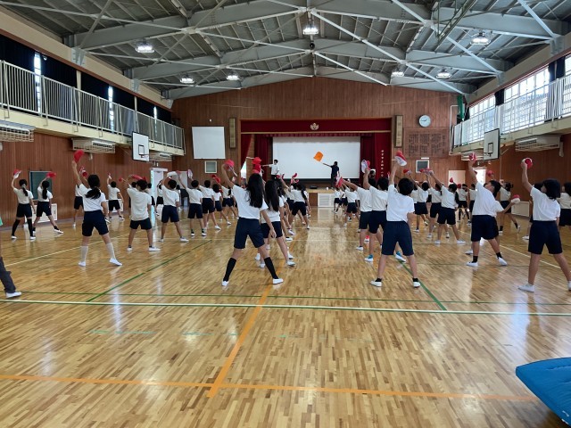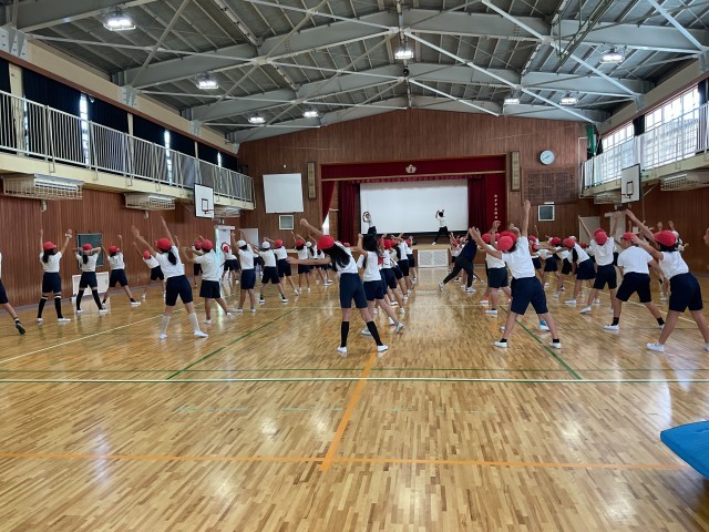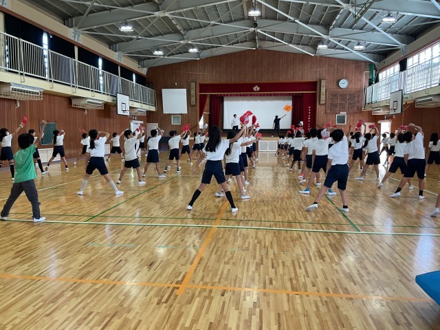 本日5時間目、体育館では4年生が運動会に向けて、団演の練習を行っていました。ラジオ体操の後、前回の復習から開始です。演技は旗を使うようですが、今日は赤白帽子を旗の代わりにして力強く動かしていました。
