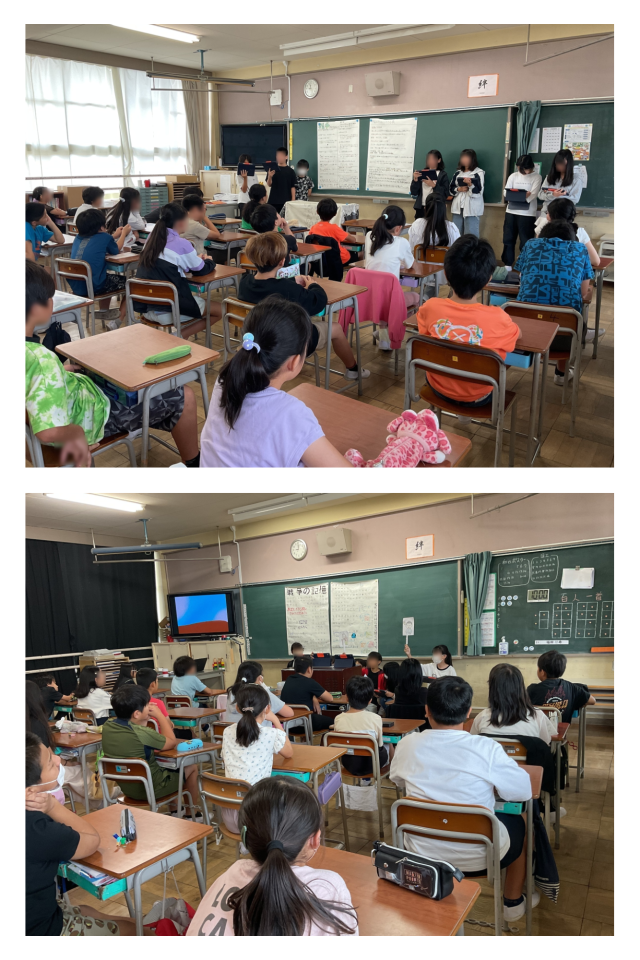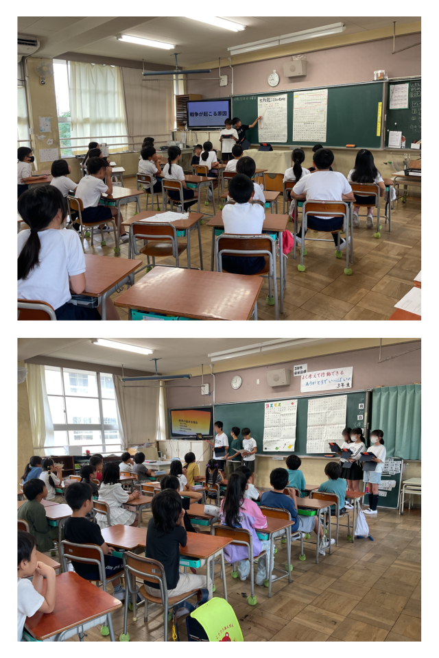 本日1時間目、全校児童で平和について考える時間を持ちました。校長先生のお話の後、6年生が修学旅行の報告(平和について学んだこと)を他の学年の皆さんに伝えてくれました。6年生は、どの学年にもわかるように工夫を凝らして、とても上手に伝えていました。聞いている児童の皆さんも、ものすごく真剣に聞いていました。船橋小の皆さんの立派な姿勢に、感心しました。