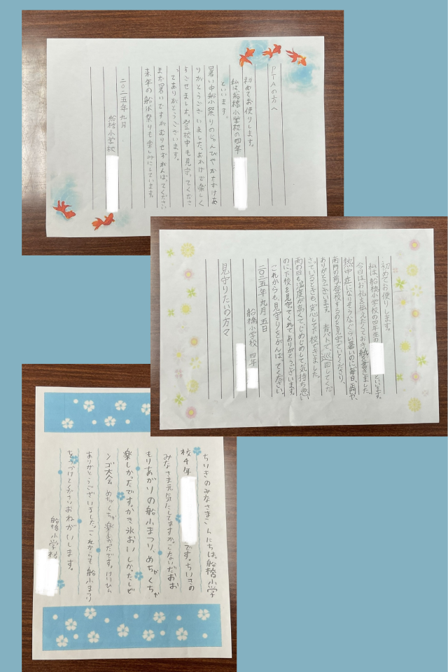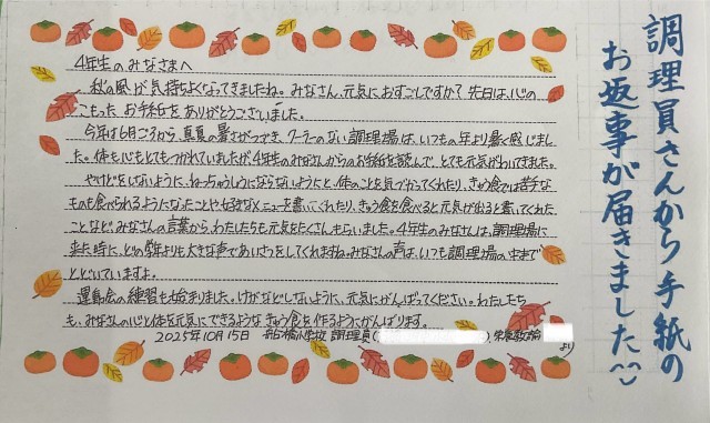 先日、4年生が手紙の書き方の授業で、実際にお世話になっている方にお手紙を書きました。地域の方やPTAの方への心のこもったお手紙は、次の会議の際にお渡しいようと思っています。きっと喜ばれると思います。学校の職員へのお手紙はすでに渡されていて、調理員さんからはお返事もいただきました。気持ちを伝えるって大切なことですね。