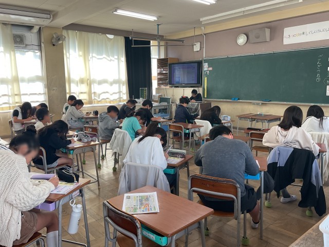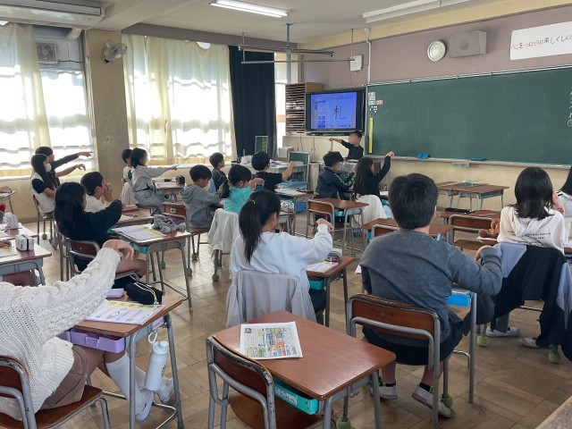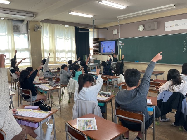 本日4時間目、4年2組では国語の授業で漢字の練習をしていました。今日の漢字先生が前で書き順を示し、みんなも手を上げて一斉に書き順の確認と読み方の確認をしていました。その後それぞれのノートに書いて練習していました。