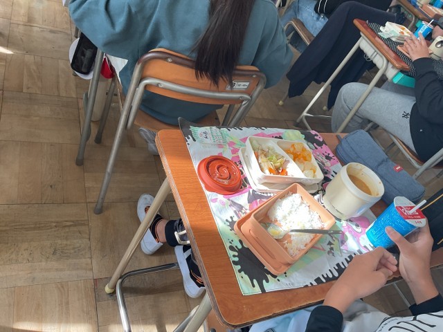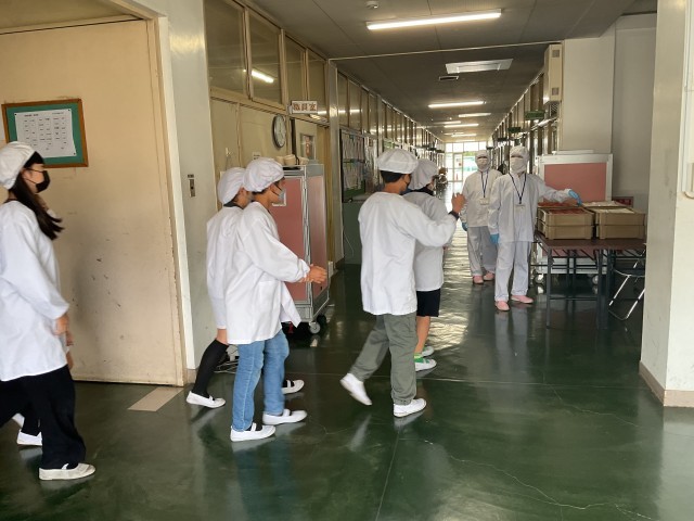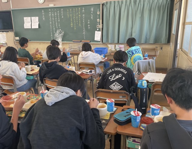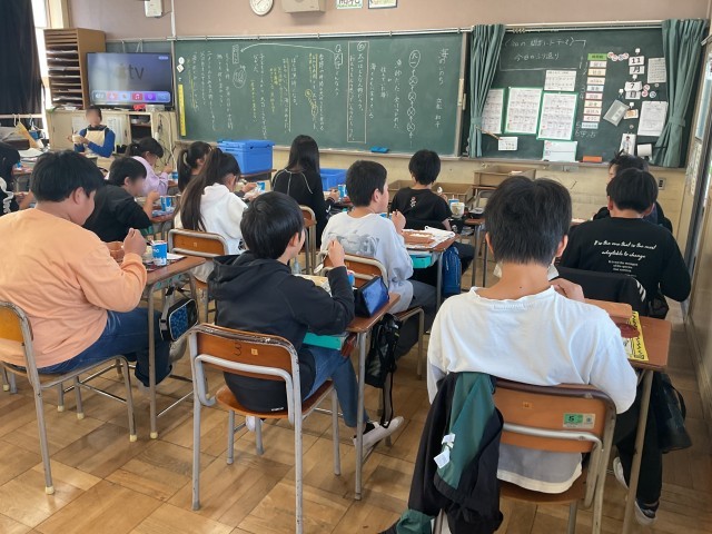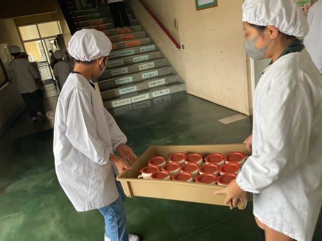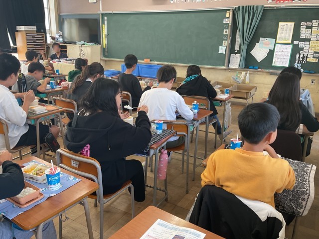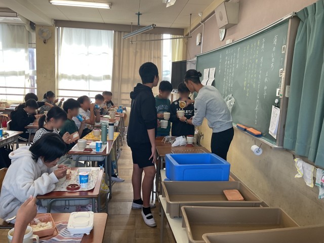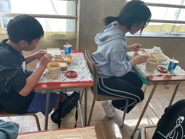 今日の6年生の給食は中学校バージョン。牛乳の代わりに今日は飲むヨーグルト、ご飯と小おかずのパッケージがひとつずつと、汁物のポットがひとつ、一人分ずつ容器にセットされているので配膳も簡単でした。児童の皆さんは「めっちゃ美味しい」「想像の3倍美味しい」と大満足の様子でした。だんだん中学校への期待が膨らんでいきますね。