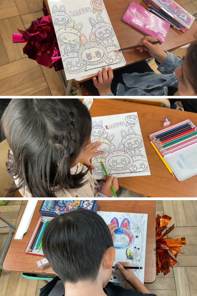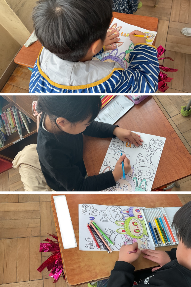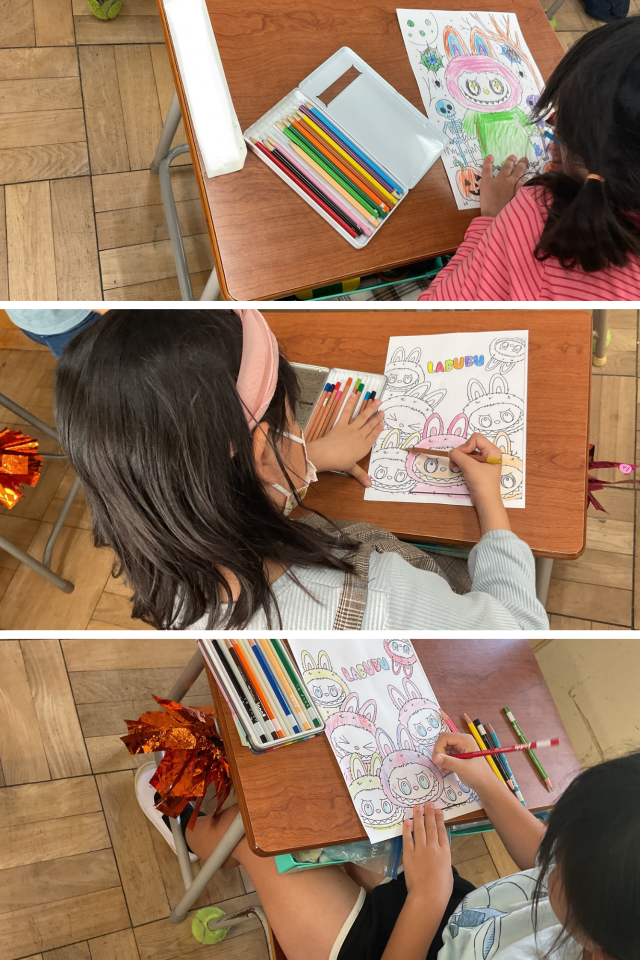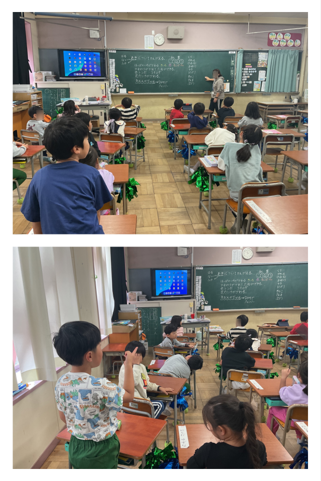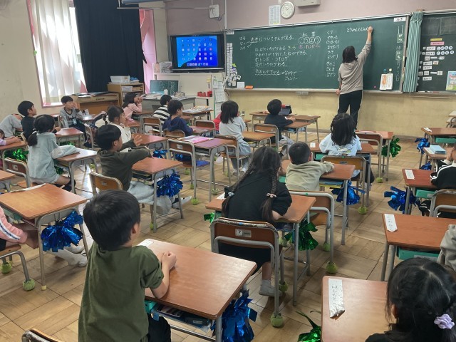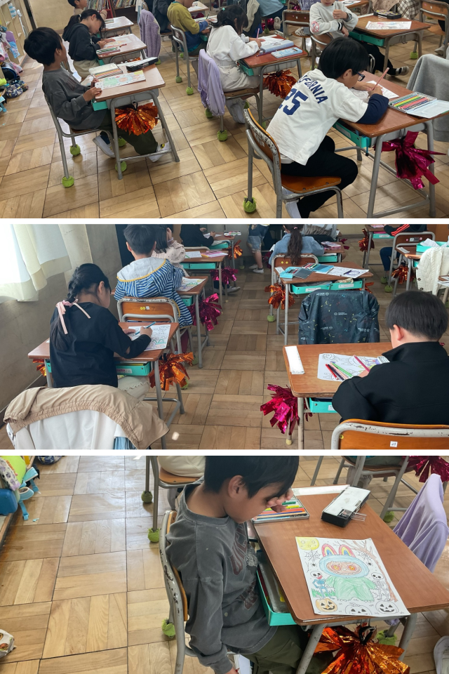 本日5時間目、1年1組は生活で「秋」について考えていました。児童の皆さんからは、冬に冬眠する動物がその準備をしているという意見が出ていました。1年2組は図工でぬり絵に取り組んでいました。みんさんとても丁寧に集中して取り組んでいました。
