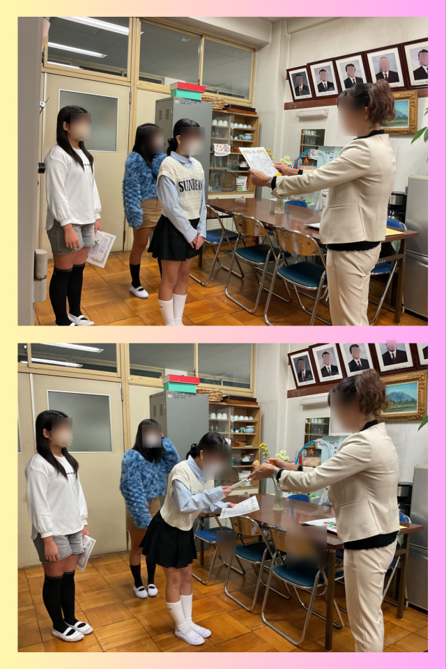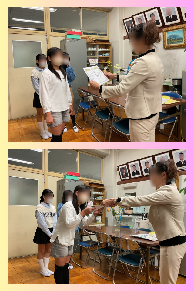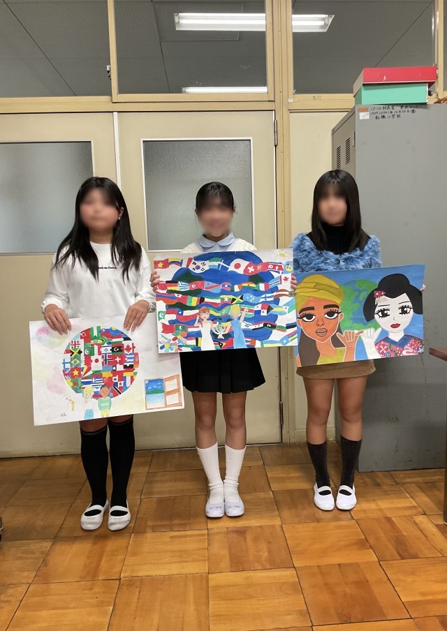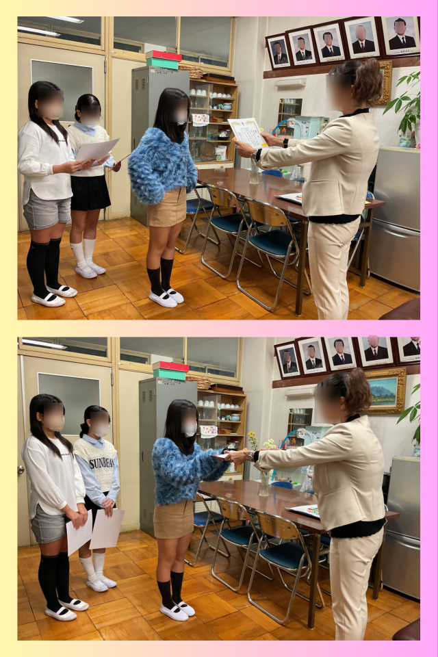 本日の中休みに校長室にて、枚方平和ポスター展での入賞者を表彰しました。毎年参加している展覧会で、今年度は3名の6年生が佳作に入賞しました。おめでとうございます!