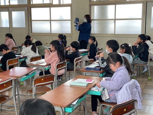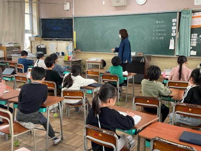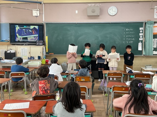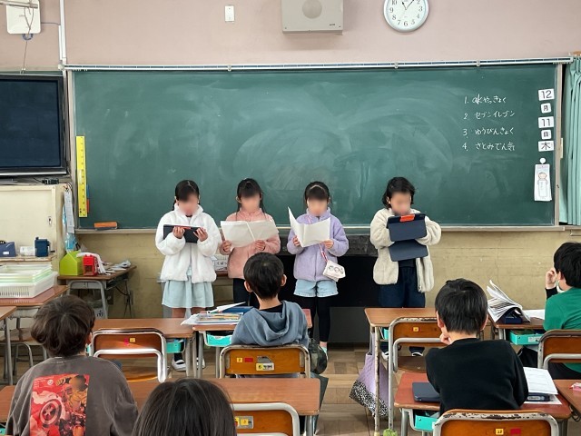 本日3時間目、2年2組では生活の授業で、発表会が行われていました。「お店屋さんにインタビューをしよう」ということで、色んな地域のお店屋さんに行って聞いてきたことを班でまとめ、今日は発表の日でした。タブレットにまとめたことをそれぞれが分担して発表しました。写真をTV画面に映し出して説明している班もありました。よく工夫していました。