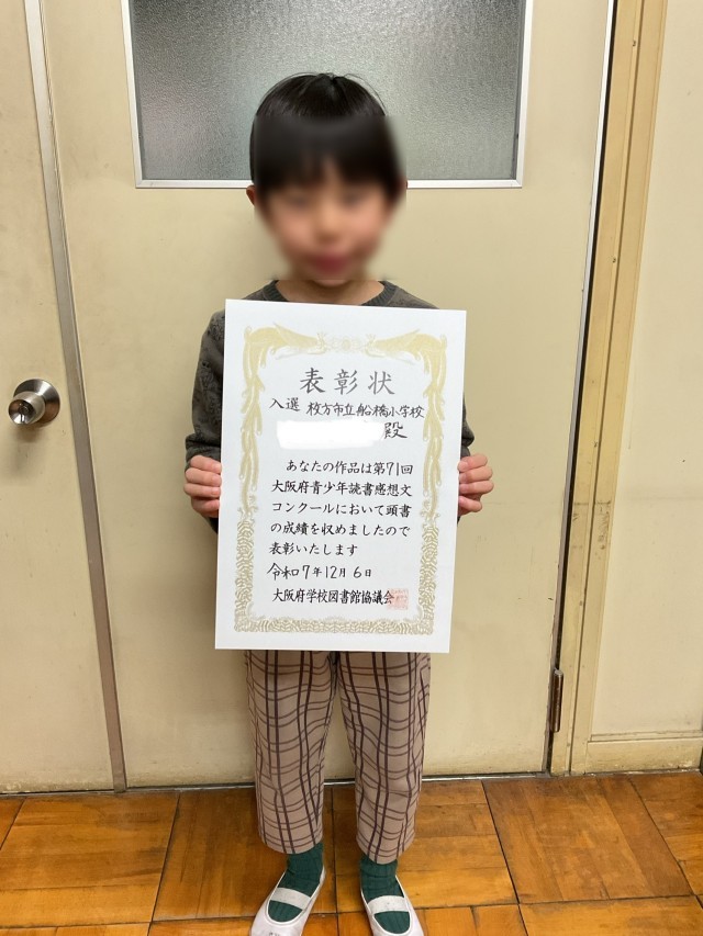 本日終業式の後、読書感想文の表彰を校長室で行いました。本校2年生の児童の読書感想文が枚方で選ばれ、大阪府青少年読書感想文コンクールにおいて入選しました。おめでとうございます!