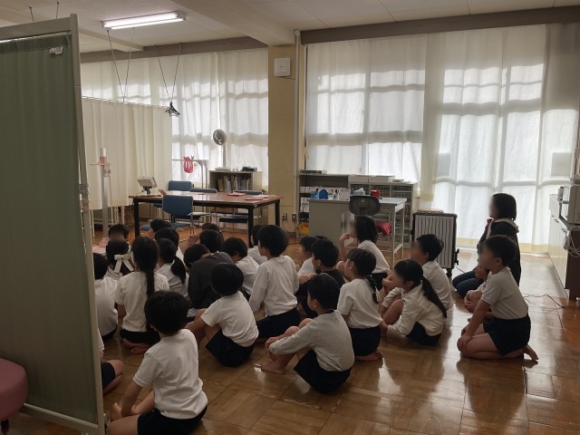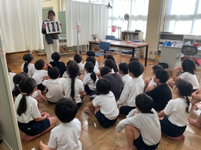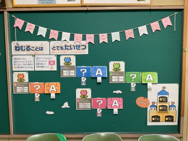 本日3時間目の最初、2年2組さんが2測定を行っていました。最初に養護教諭の方から骨の成長についてのお話があり、皆さん興味津々でお話を聞いていました。保健室の外の壁には、睡眠についてのクイズが掲示してあります。児童の皆さん挑戦してみましょう。