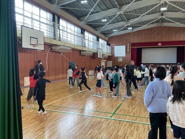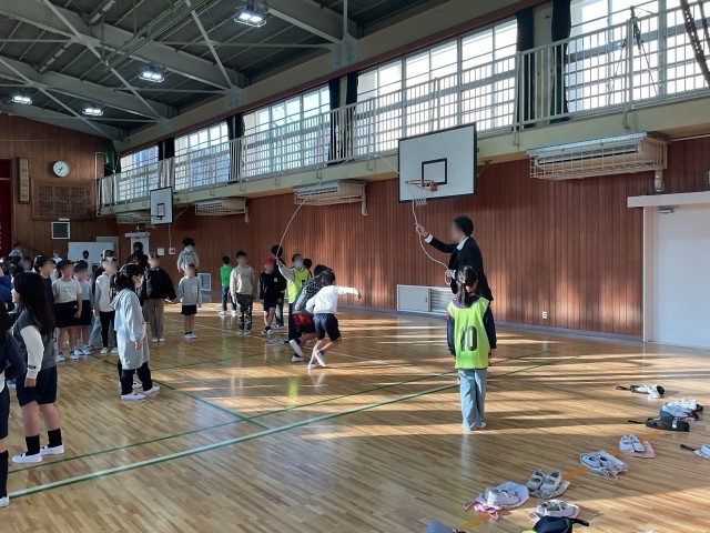 本日の朝、体育館では2年生と4年生の兄弟学年で大縄とびの練習が行われていました。4年生は優しく2年生をエスコートしていました。