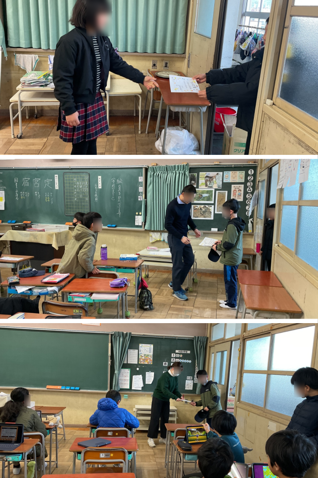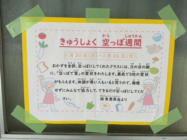 1月20日(月)より26日(月)までの期間、給食委員会の取り組みで「給食空っぽ週間」を行っています。おかずをできるだけ残さず食べよう!ということで、クラス単位で取り組んでいますが、児童の皆さんには、無理せず食べれる量でクラスに協力してもらっています。今朝は、昨日空っぽにしたクラスに、給食委員会の人たちが賞状を渡しに行っていました。